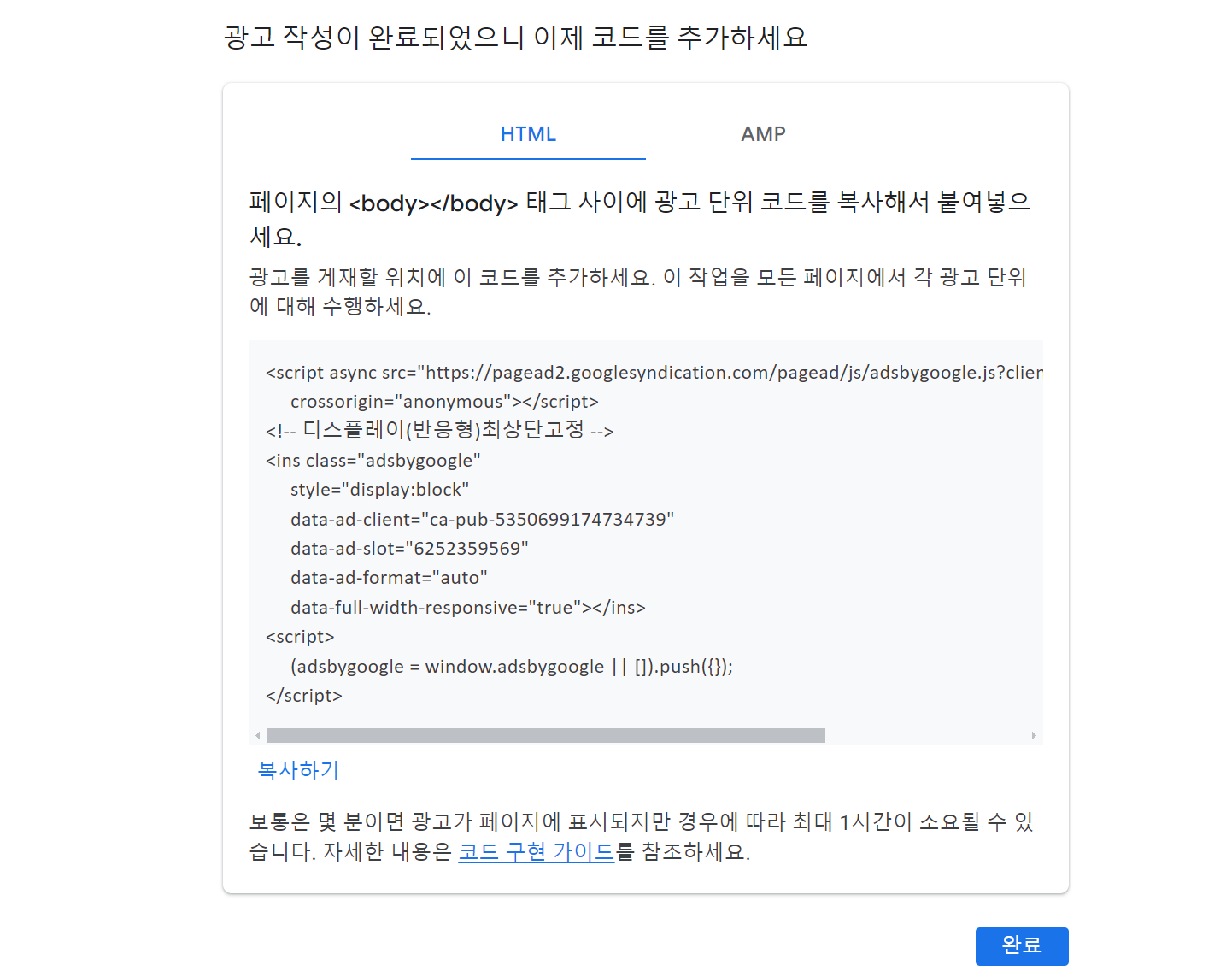클릭하면 HTML 복사하기 해서 내 티스토리에 넣기만 하면 된답니다. 생각보다 수동설정 어렵지 않게 이용하실 수 있습니다. 이제 애드센스도 합격하시고 애드센스 자동설정과 수동설정도 다 총정리해 드렸으니 설정하시고 티스토리 블로그