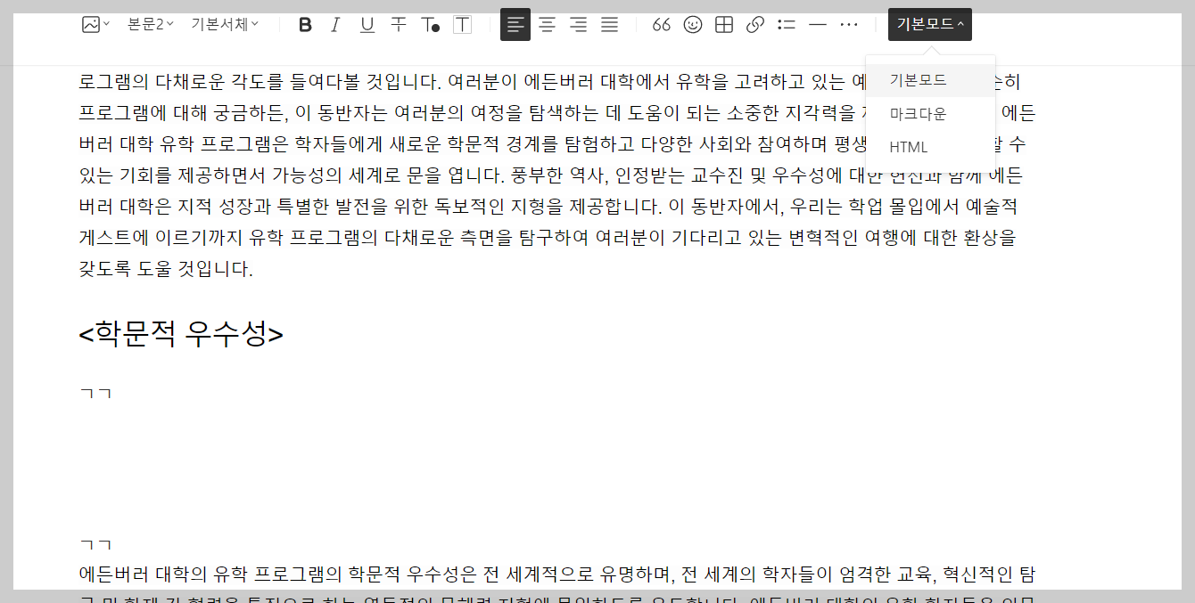 5) 아래와 같이 내가 쓴 티스토리 글에 원하는 광고 장소에 알아보기 쉽게 나만에 표시를 해 두시고 오른쪽 상단 기본모드에서 HTML로 들어갑니다.