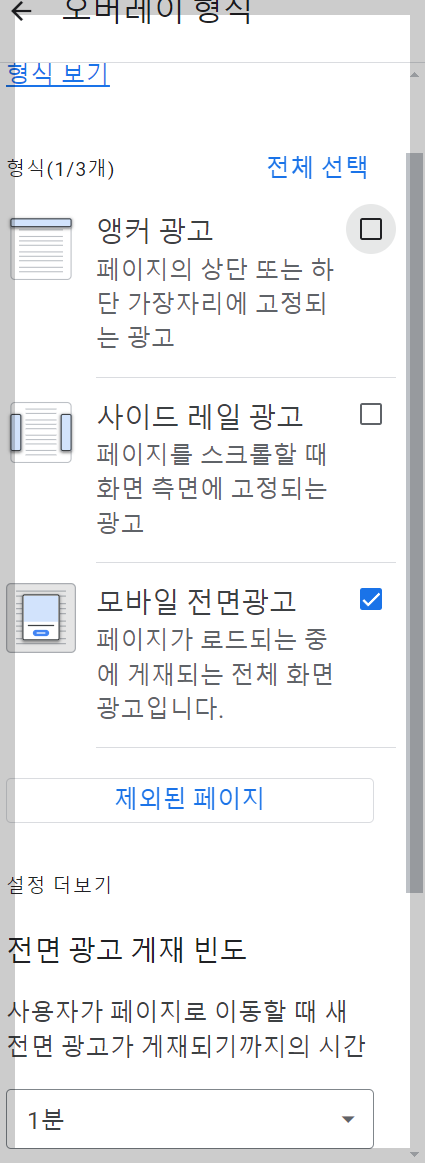클릭 후 이 화면이 나오면 오버레이 형식과 인페이지 형식만 설정하겠습니다.내 블로그에 자동광고 뜰 때 깔끔하게 광고 보일 수있는 설정으로 해보겠습니다. 사실 광고 설정은 본인 취향에 맞쳐 이용하시다가 아니시면 또 다른 형식으로 변경하시면 된답니다.