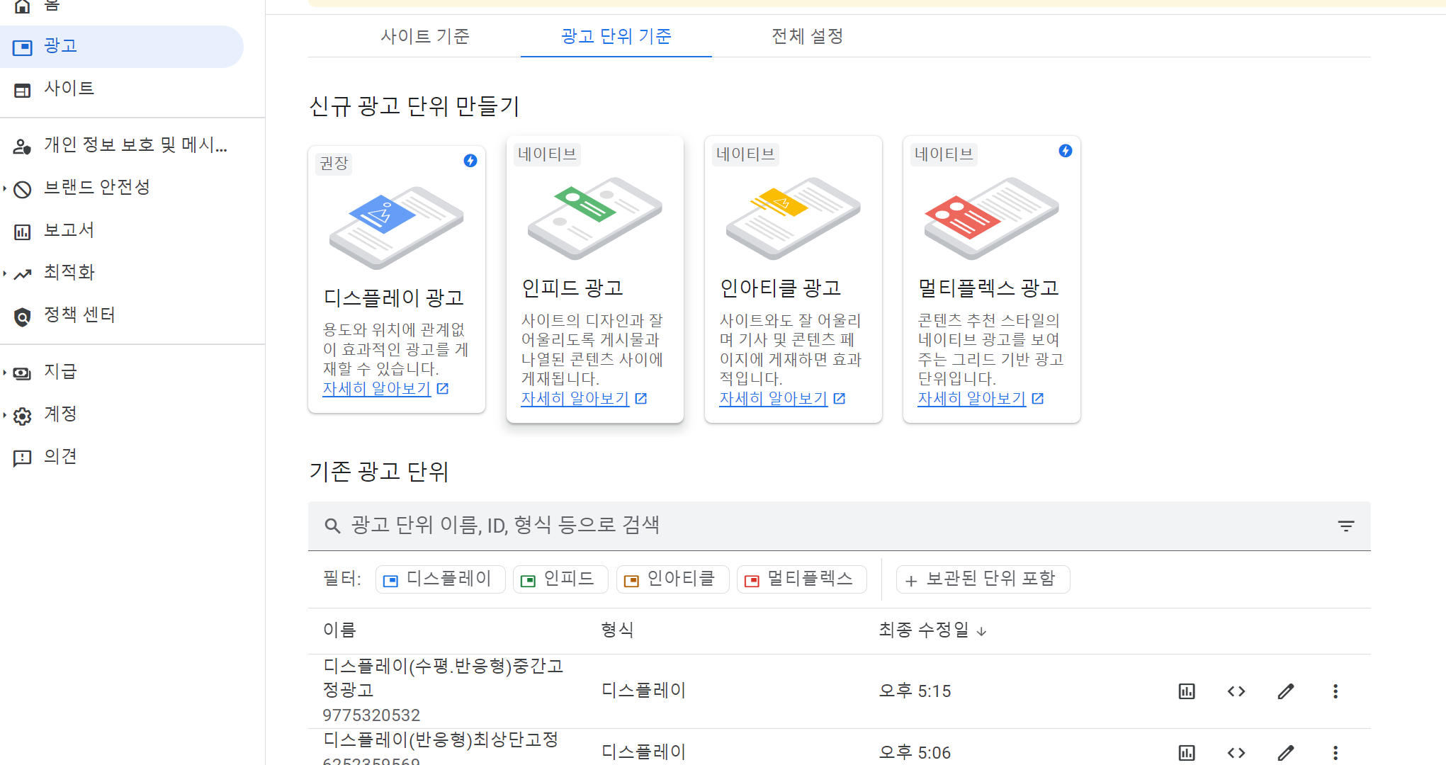 2 광고 단위 기준 클릭해서 디스플레이 광고 들어갑니다.