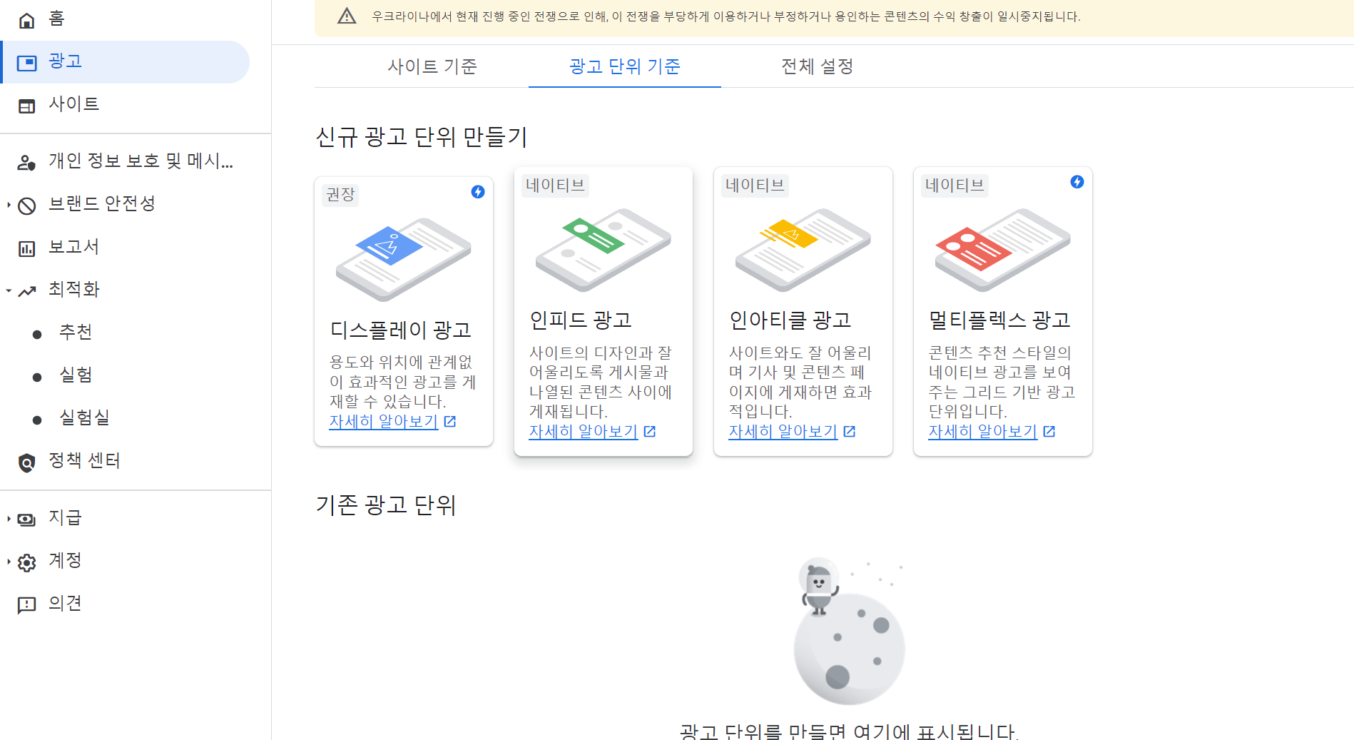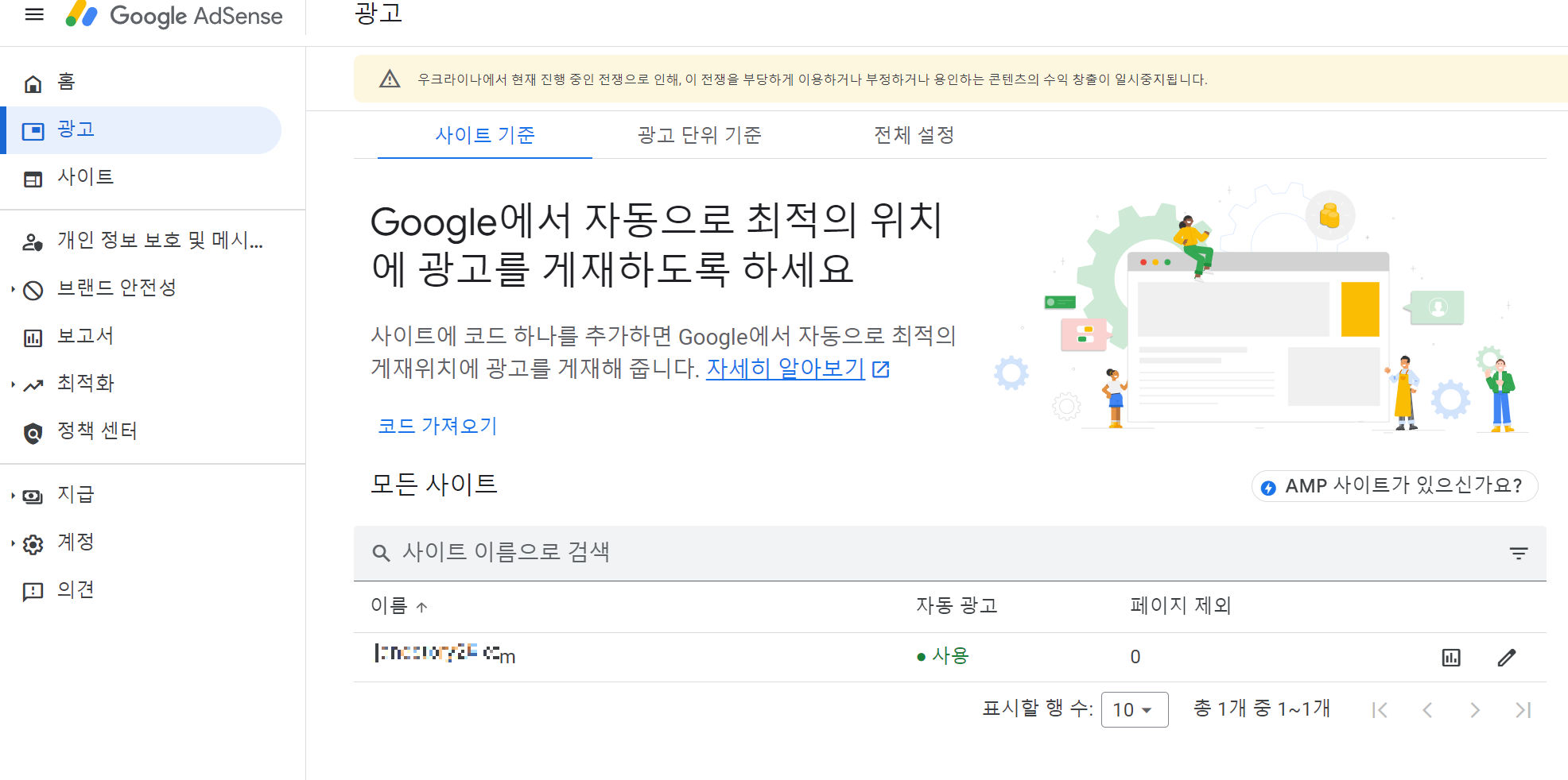 1) 애드센스화면에서 광고클릭 해서 들어갑니다.