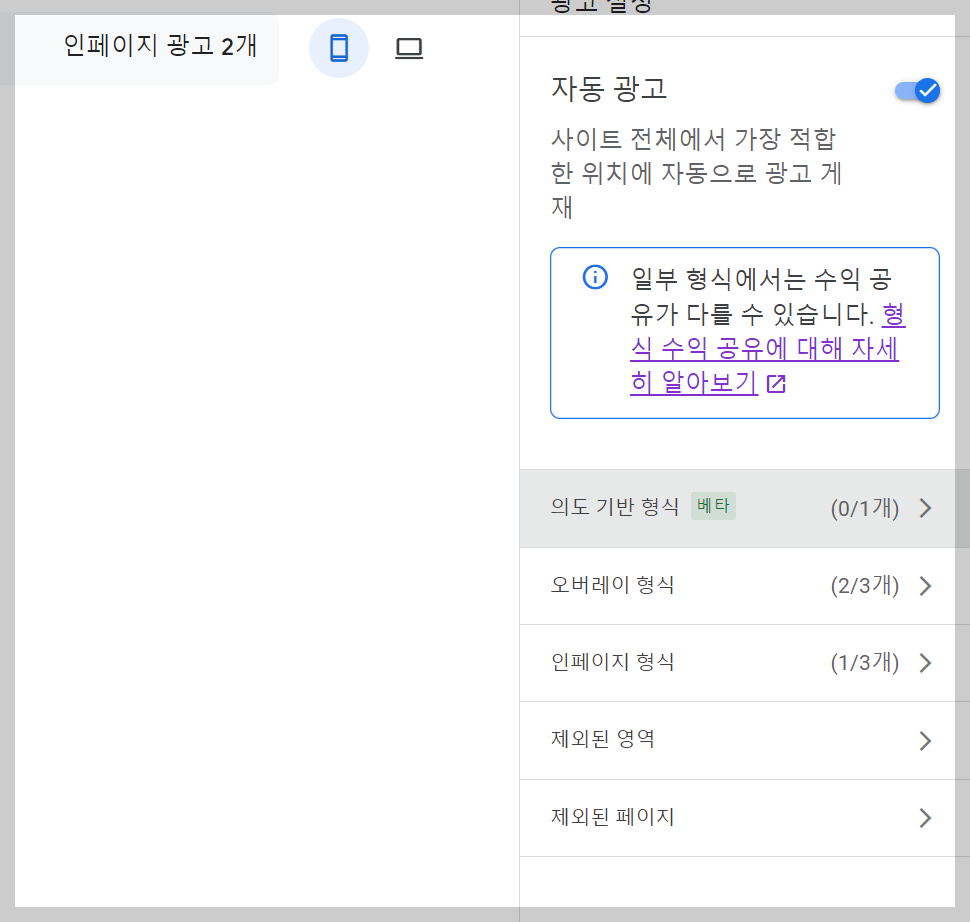 단가들도 싸진답니다. 인페이지 형식 자동광고는 노체크로 하시고 수동광고로 내가 원하는 글에 광고를 심는 게 좋습니다.