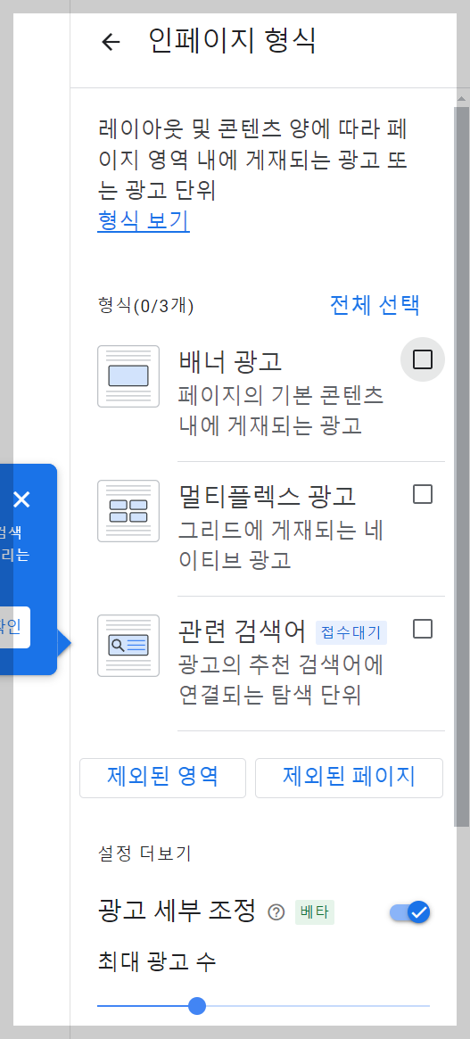 2) 다음은 인페이지 형식은 모두 체크 안 하시는 게 좋습니다. 최대 광고 수는 적당하게 설정하시면 됩니다.