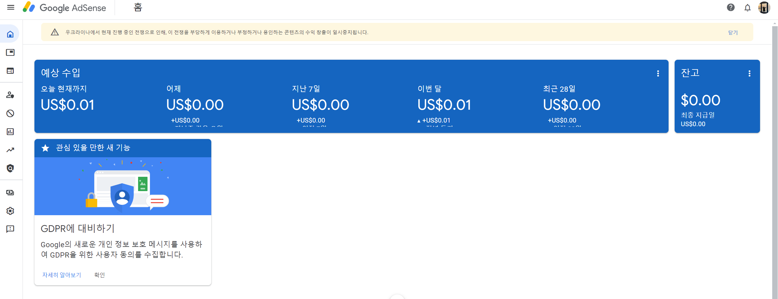 승인 후 구글애드센스 홈 화면도 이제 변경되어 확인됩니다. 앞으로 이 수익화면 열심히 블로그 활동하여 돈 많이 버는