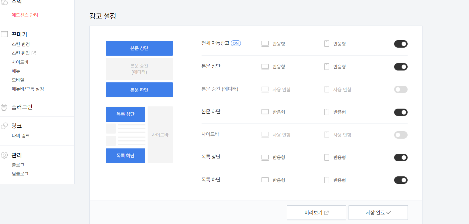 광고 설정 창에 전체 자동광고는 꼭! 켜 놓으셔야 앞으로 광고창이 보이니 중요합니다.