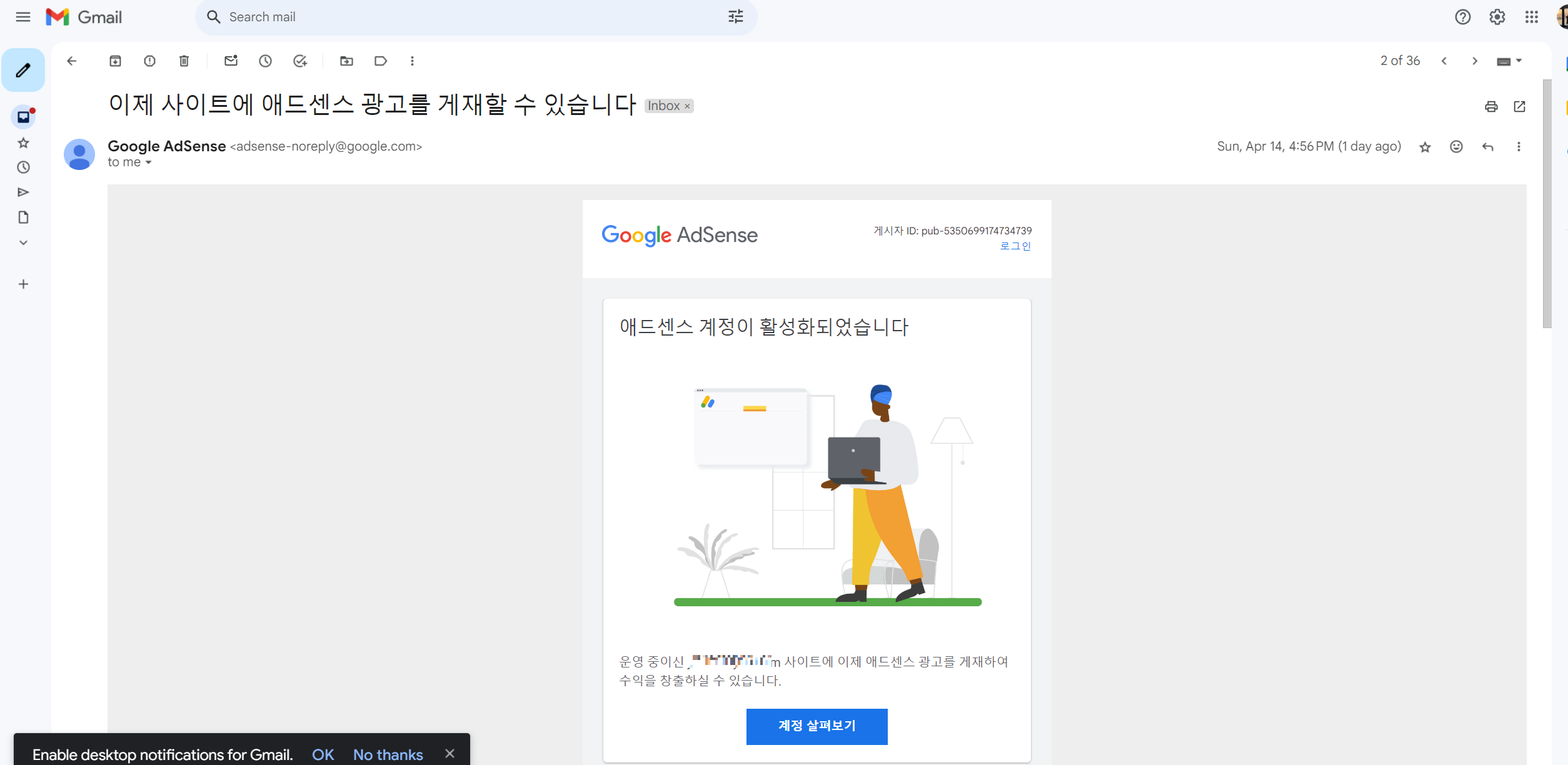 애드센스 승인여부 확인 하는 법은 " 애드센스 계정 활성화되었습니다 " 위처럼 이메일을 받습니다.
