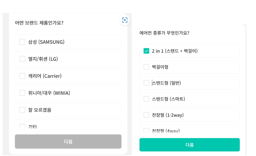 숨고 홈페이지 검색창에서 에어컨 청소라고 입력해서 검색합니다. 그리고 숨은 고수의 무료견적을 받기 위해 지역, 브랜드, 에어컨 종류가 무엇인지 세부적인 질문창에 체크하시면 된답니다.