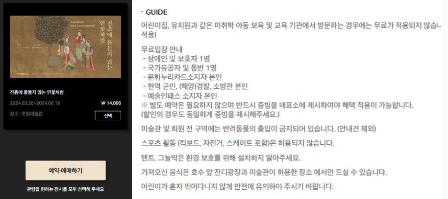 호암미술관 관람은 인터넷 예매가 필요합니다. 호암미술관 ticket.hoammuseum 홈페이지 들어가셨서 '진흙에 물들지 않는 연꽃처럼 ' 선택 예매하기로 들어가시면 됩니다.