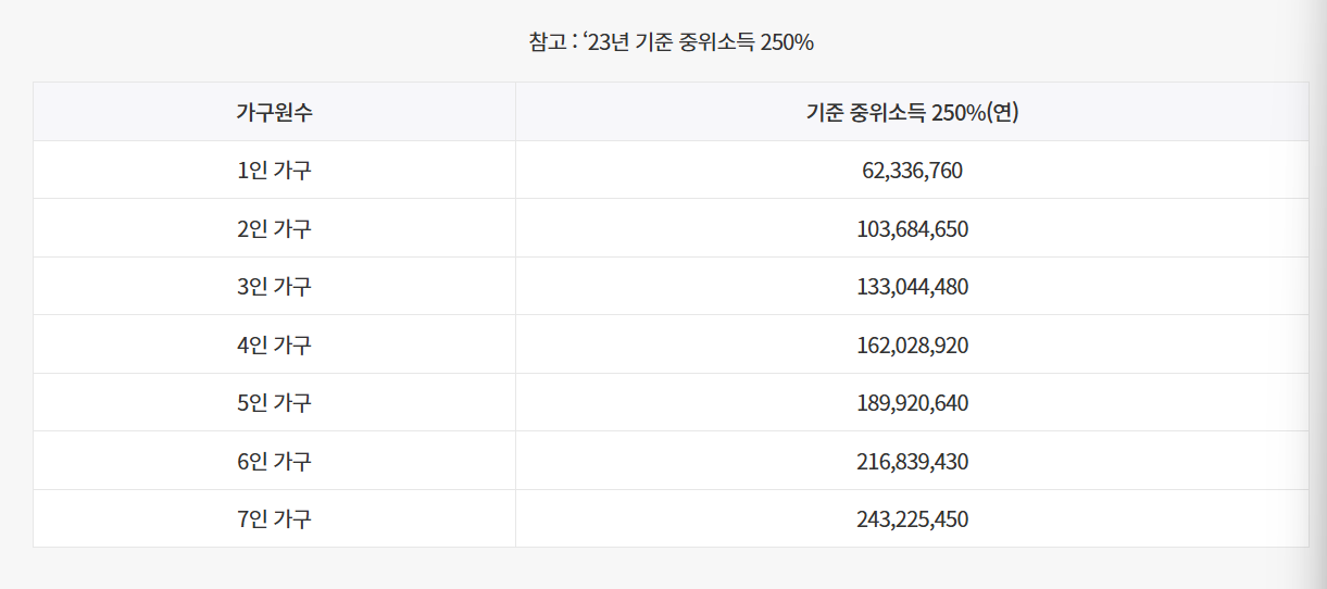 가구원 수에 따른 기준 중위소득 250% 이하에 해당하는 자