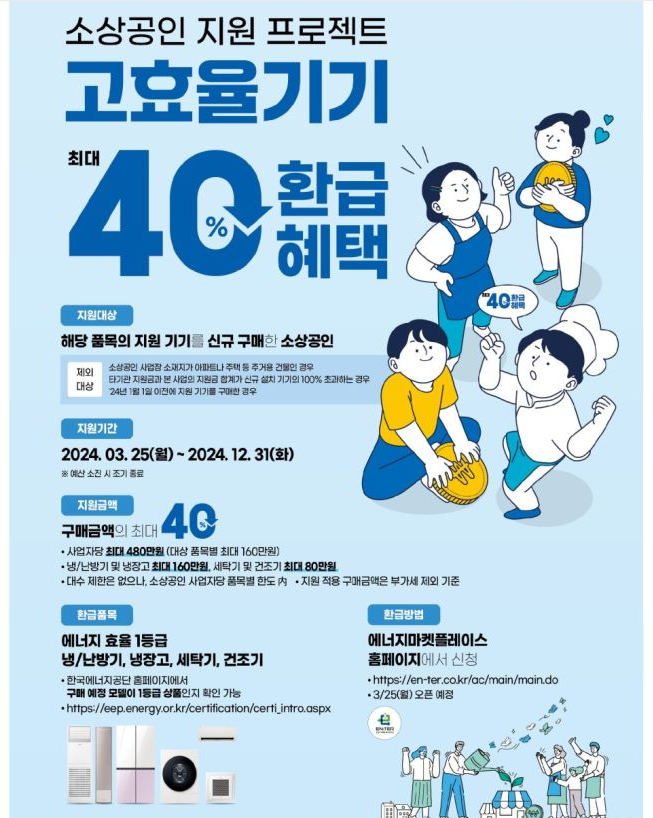 ○소상공인을 대상으로 에너지효율 개선 및 전기요금 부담완화를 위해 고효율 기기 구입 시 구매비용의 일부를 지원해 주는 사업입니다.