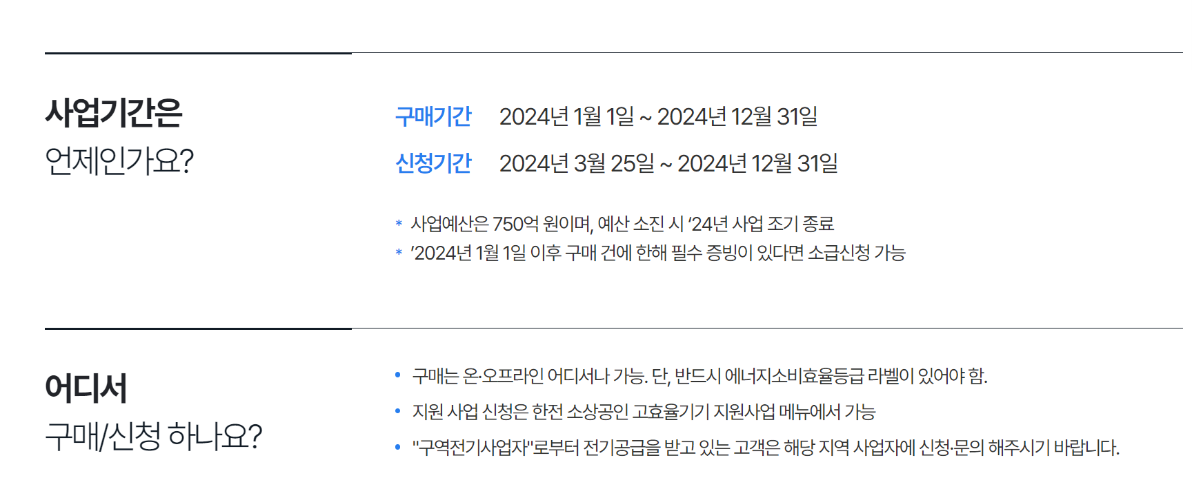 사업기간: 2024년 1월 1일 이후 구매 제품 /신청기간 : 2024년 3월 25일~ 12월 31일 (예산 소진 시 사업종료)