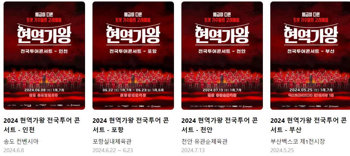 현역가왕 전국투어 콘서트 예매는 현재 인터파크티켓에서 예매 진행하고 있습니다.