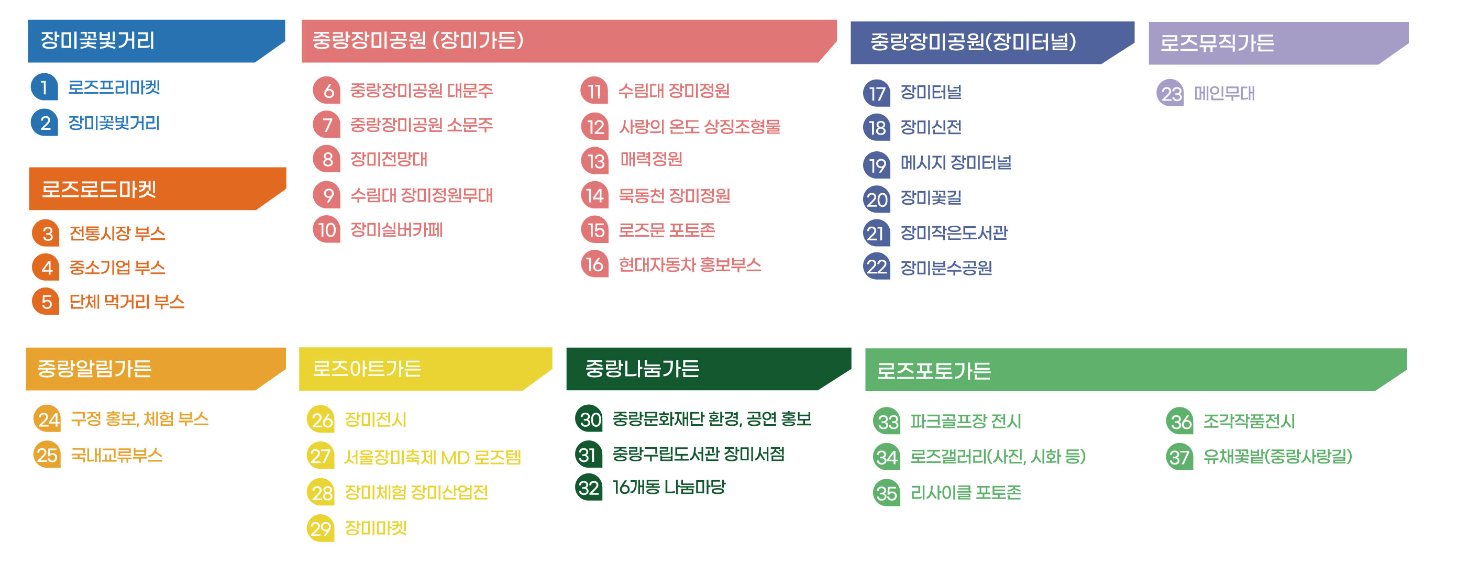 - 장미전시, 장미체험, 장미산업전, 로즈템부스, 장미마켓, 중랑마눔마당, 중랑구 체험홍보, 국내교류관, 장미꽃빛거리프리마켓, 먹거리 등