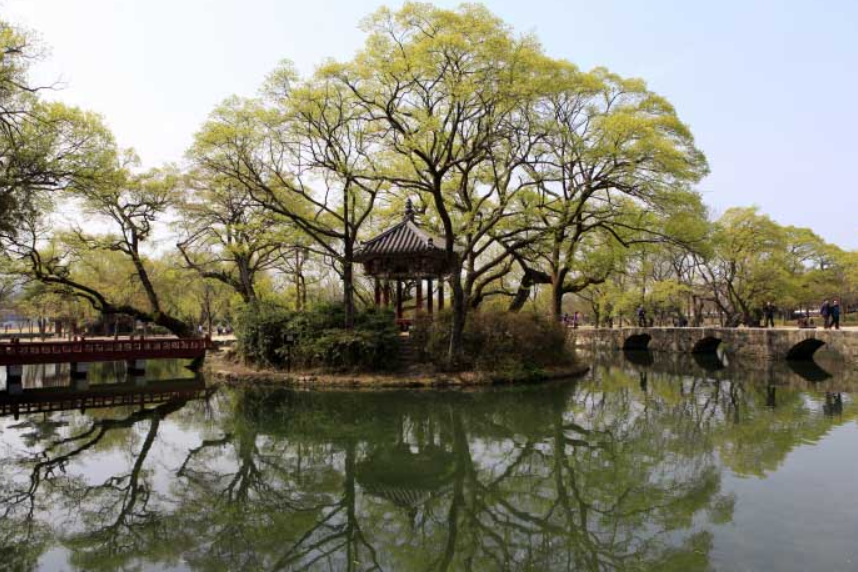 완월정 북쪽으로 둘 사이에는 저수지가 있고,오작교와 방장정 영주각 등이 삼신산을 이룹니다. 물가로는 버드나무 고목과